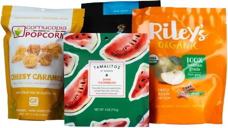 Durable 3-side seal pouches available in customizable films, structures, and finishes for versatile product packaging.